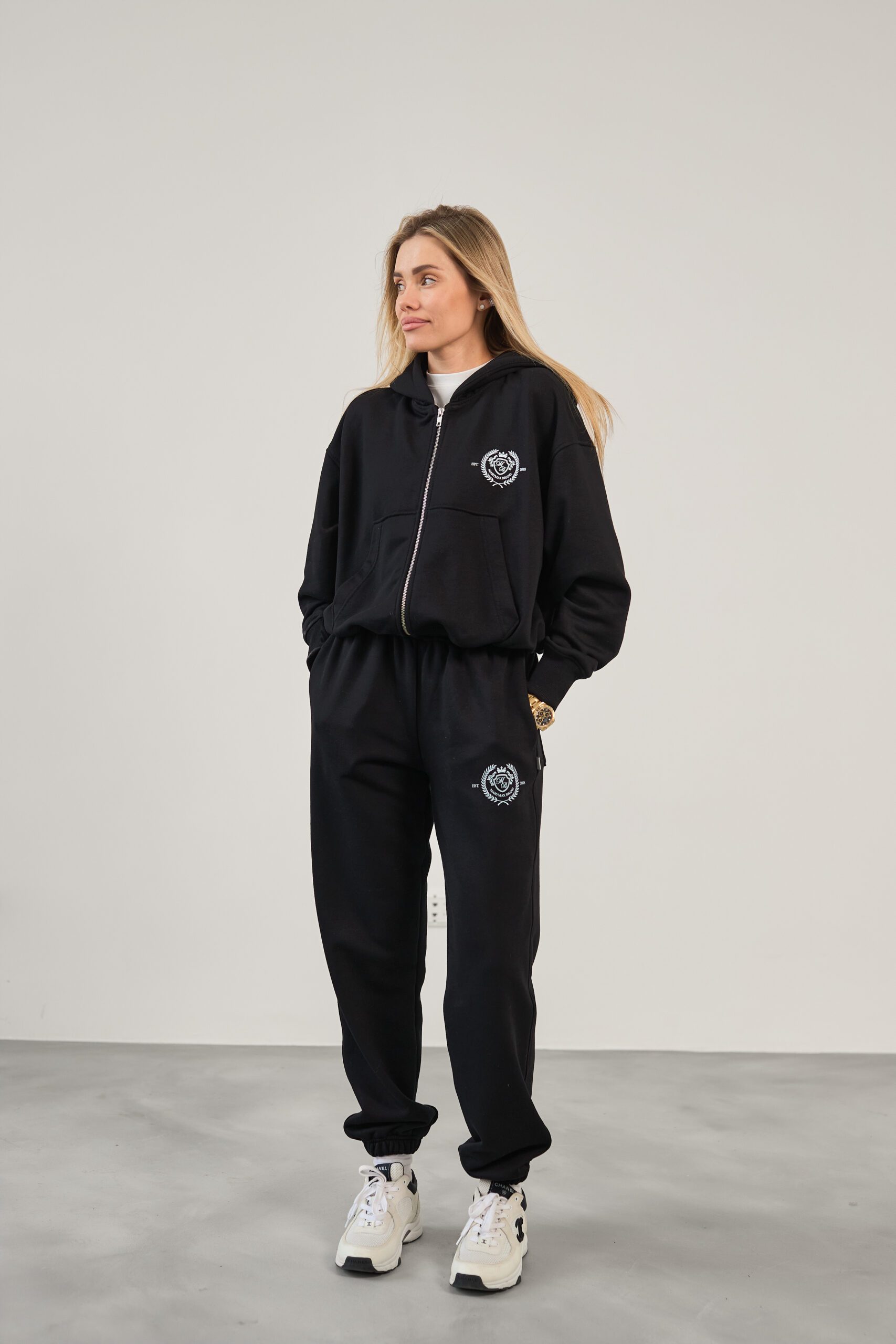 – Штани джогери з еластичним поясом, що забезпечують зручну посадку та прикрашені принтом.
