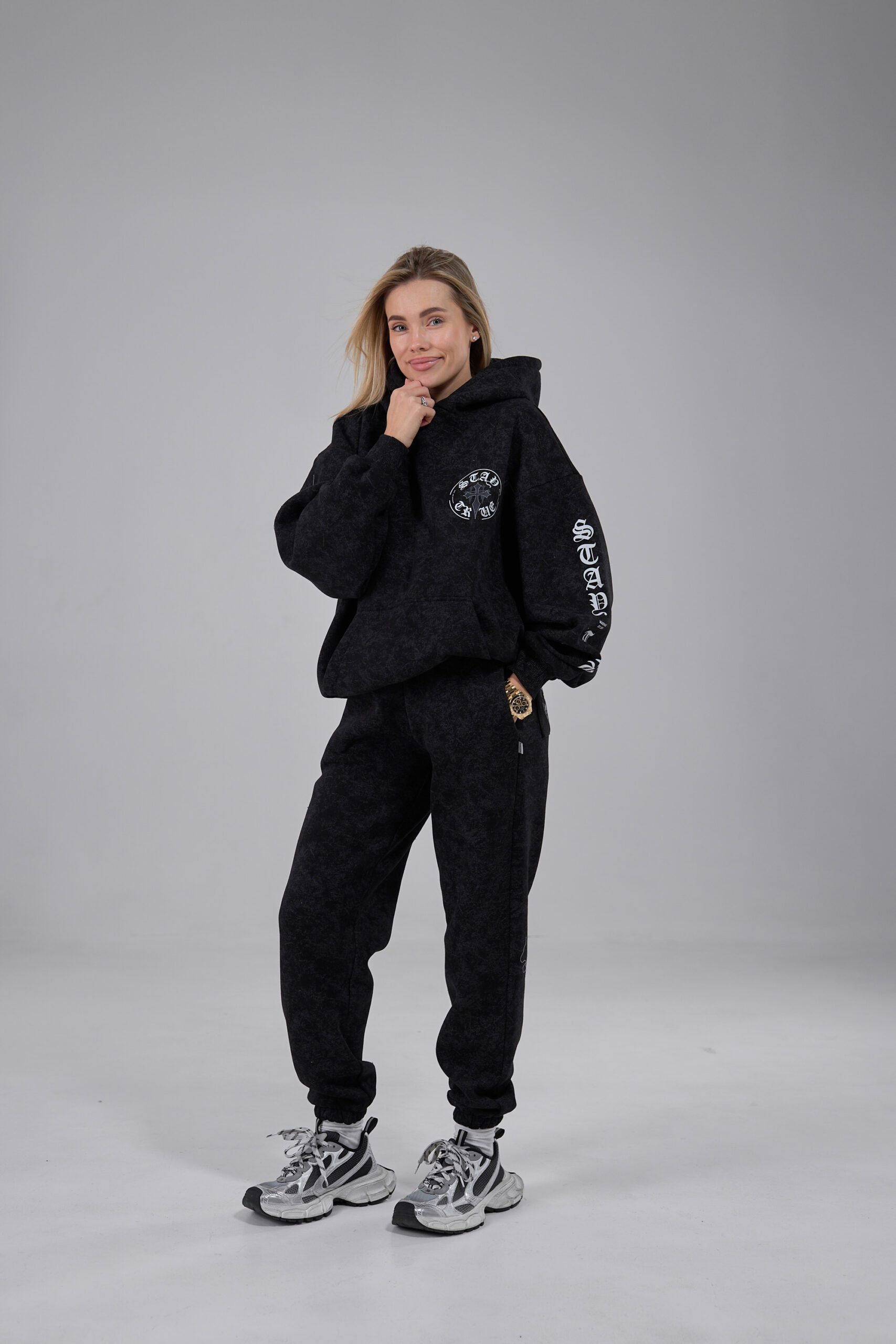 Костюм, що складається зі штанів джогерів та оверсайз худі з принтом, виготовлений із якісного флісу, з вивареним ефектом.