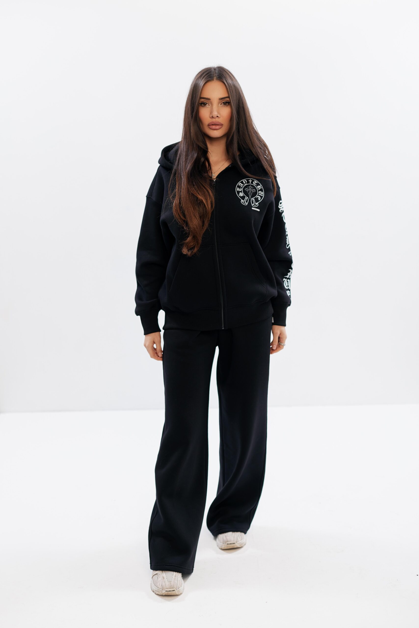 Костюм із штанами кльош та зіп худі на флісі з яскравим принтом – чудовий вибір для тих, хто цінує комфорт і стиль.