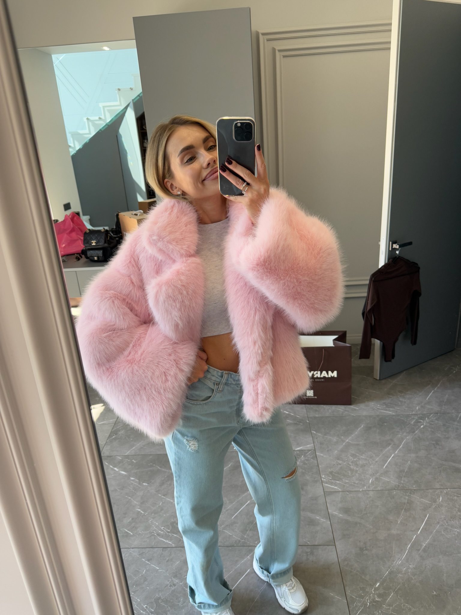 Укорочена шуба зі штучного хутра з довгим ворсом. Застібається на гачок, всередині має підкладку, рукава розширені.